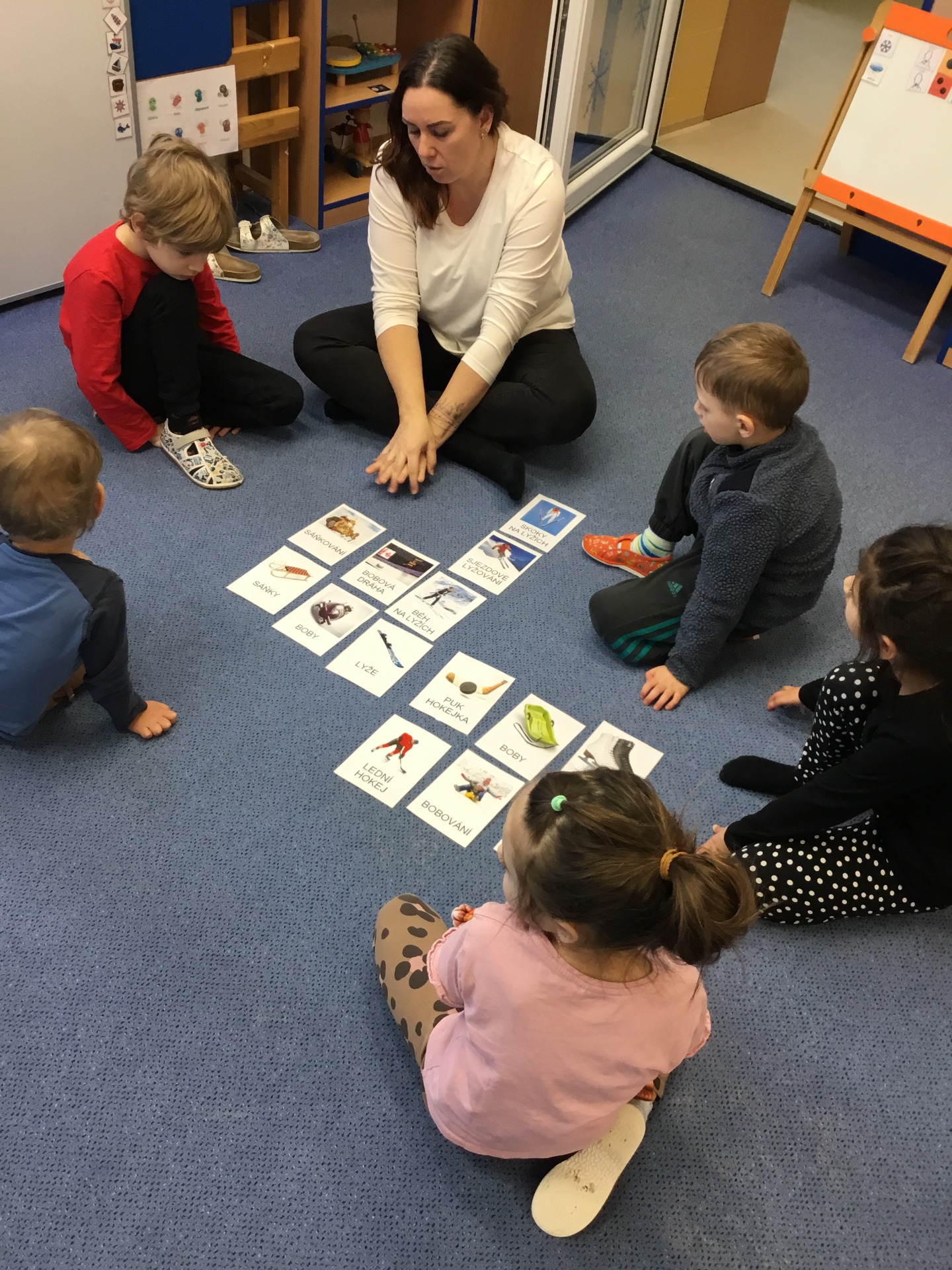 Postupně jsme si představili některé zimní a olympijské sporty, například lyžování, bruslení či hokej. Děti si vyzkoušely rozmanité pohybové aktivity inspirované těmito sporty –překonávaly jednoduché překážkové dráhy, cvičily obratnost i vytrvalost, učily se spolupracovat v týmu, relaxovaly v houpačce. Nechyběly ani tvořivé činnosti a hry s tematikou zimních sportů.