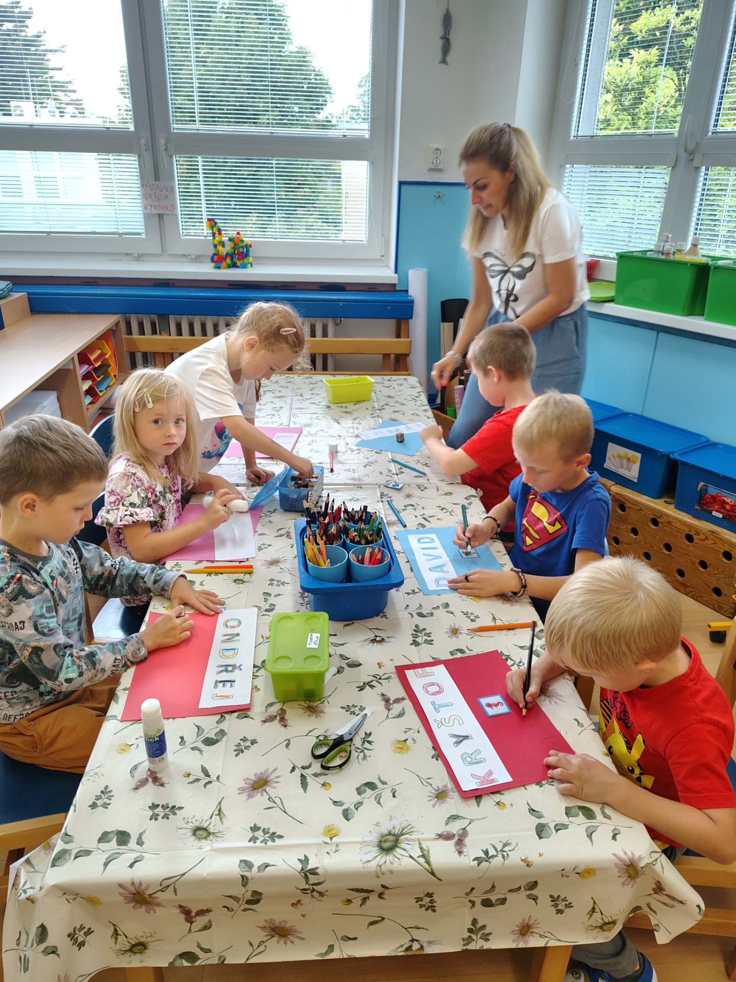 Měsíc se nesl v duchu adaptace a seznamování s prostředím školky. Děti se prostřednictvím her a aktivit navzájem poznávaly, učily se orientovat ve třídě i na školní zahradě, poznávaly svou značku a jména nových kamarádů. Abychom se všichni ve třídě cítili bezpečně a dobře, nastavili jsme si třídní pravidla, kterými se budeme řídit, a která se učíme při každodenním pobytu ve školce dodržovat. Kromě hraní, tvoření, zpívání a cvičení ve třídě jsme využívali k aktivitám a hrám také naší školní zahradu, kde jsme sklidili první úrodu mrkve, o kterou jsme se společně podělili. Podnikli jsme procházky s cílem poznat okolí naší školky, učili jsme se bezpečné chůzi po chodníku a zásady, jak správně přecházet vozovku. Zkrátka-ve školce se nenudíme, je nám tady spolu prima!